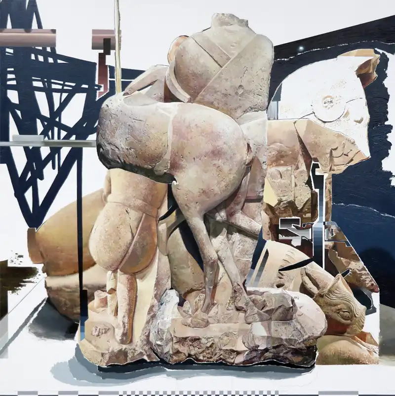 En esta muestra, el autor establece un diálogo entre arqueología e imagen digital mediante pintura, dibujo y vídeo-animación, utilizando la estratigrafía como eje conceptual. Este término, propio de la arqueología, se vincula a lo digital al aludir a la construcción de imágenes por capas como en Photoshop y a la acumulación de información en redes y buscadores.
