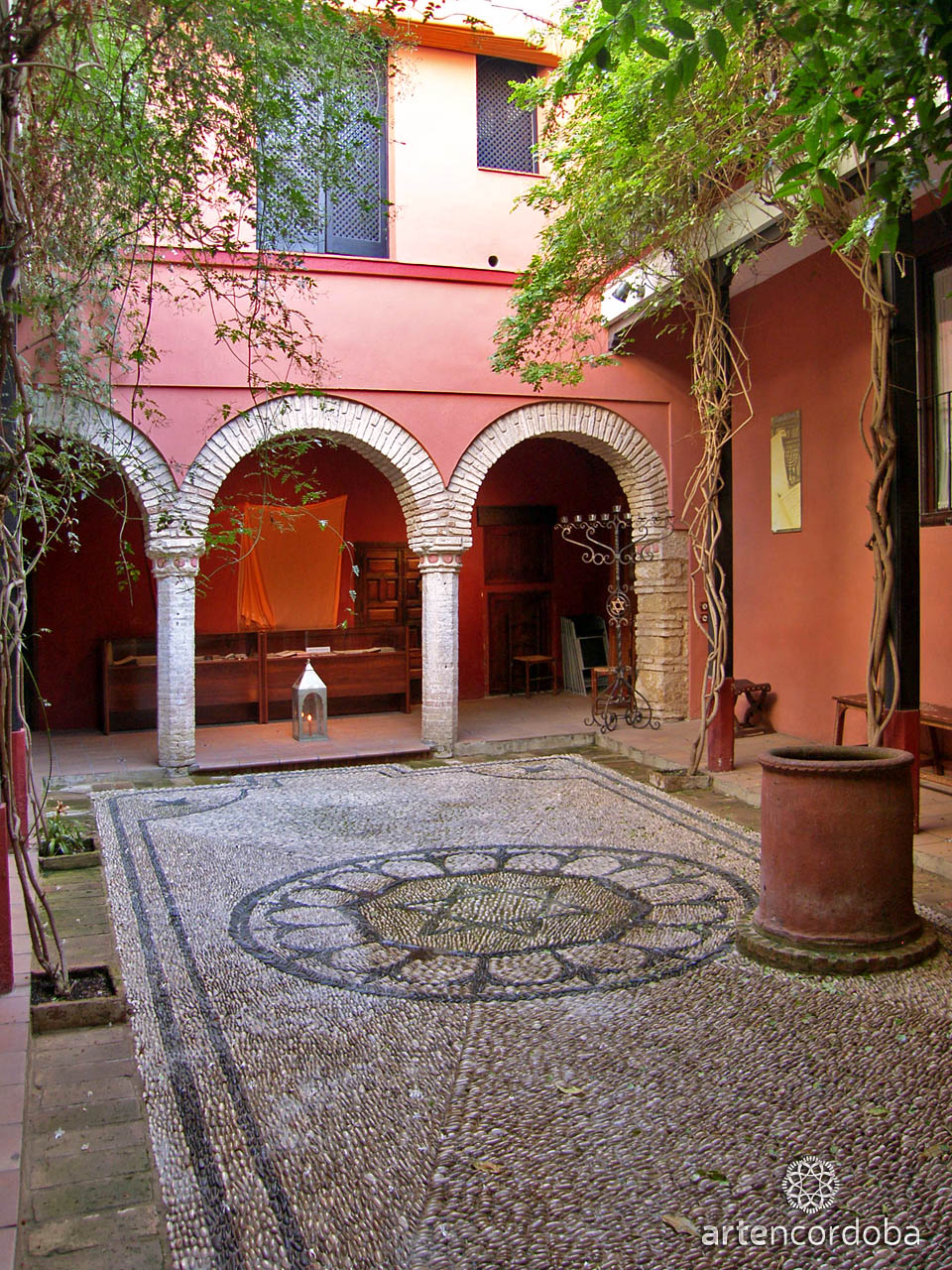Como en las casas tradicionales cordobesas, el edificio gira en torno a un patio rectangular. En sus lados menores se alzan triples arcadas de medio punto sobre pilastras en chaflán. El suelo de enchinado cordobés incorpora simbología judía, y el pozo central destaca como elemento característico.
