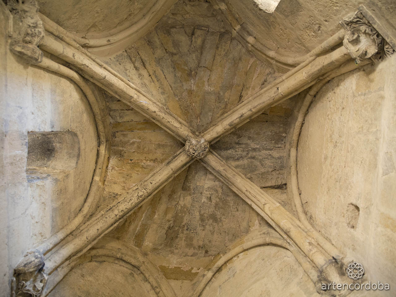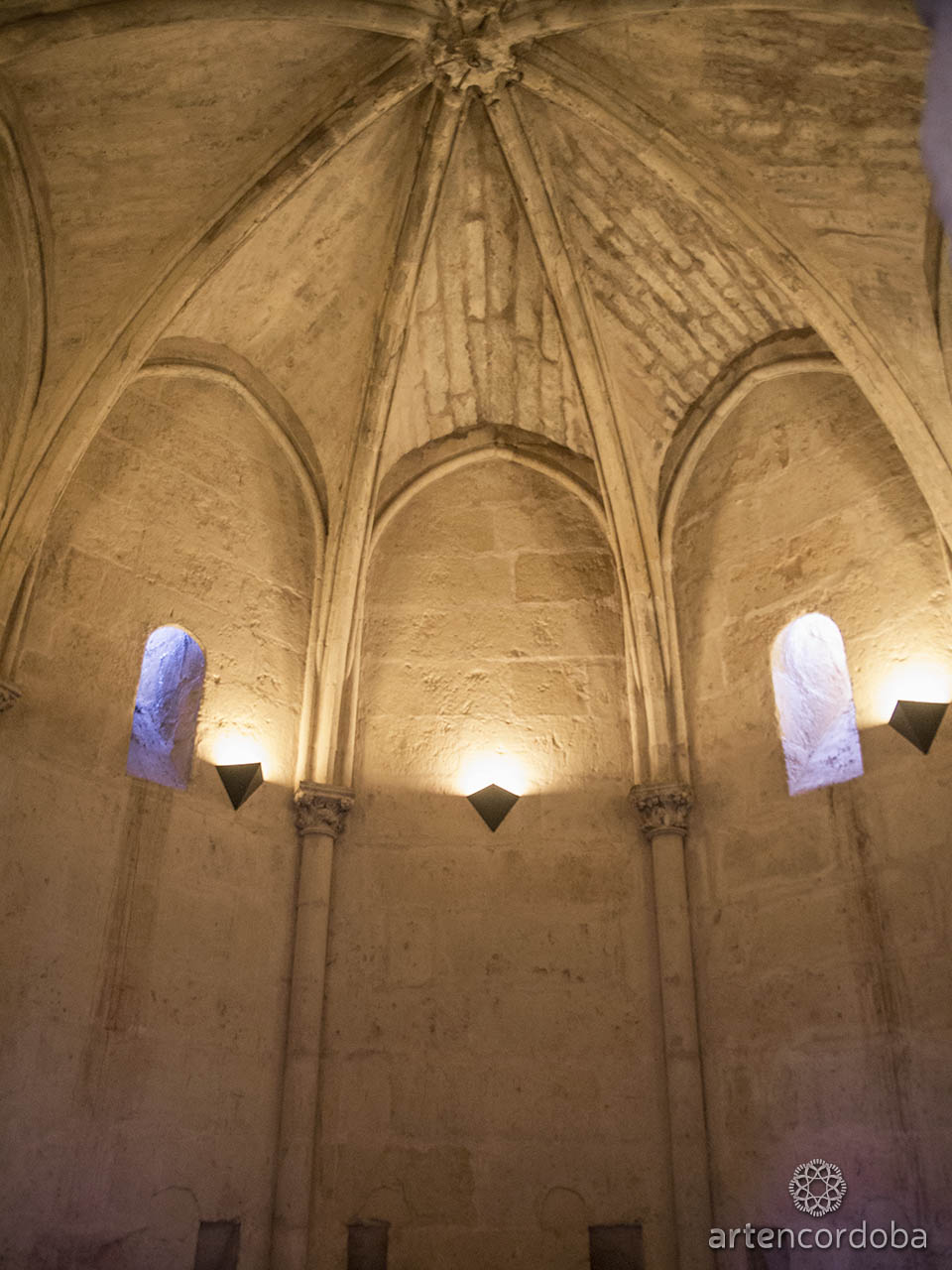 The main hall has an octagonal floor, short and not very slim columns, and a high vault, whose ribs rest on magnificent capitals decorated with reliefs of vegetable motifs. According to the tradition, this hall was the place where the first reception of the Christian Monarchs with Christopher Columbus took place. The higher terrace of the tower can be accessed through a straight stairway, where light comes from two rose windows. Its steps are held by corbels decorated with fine mouldings.