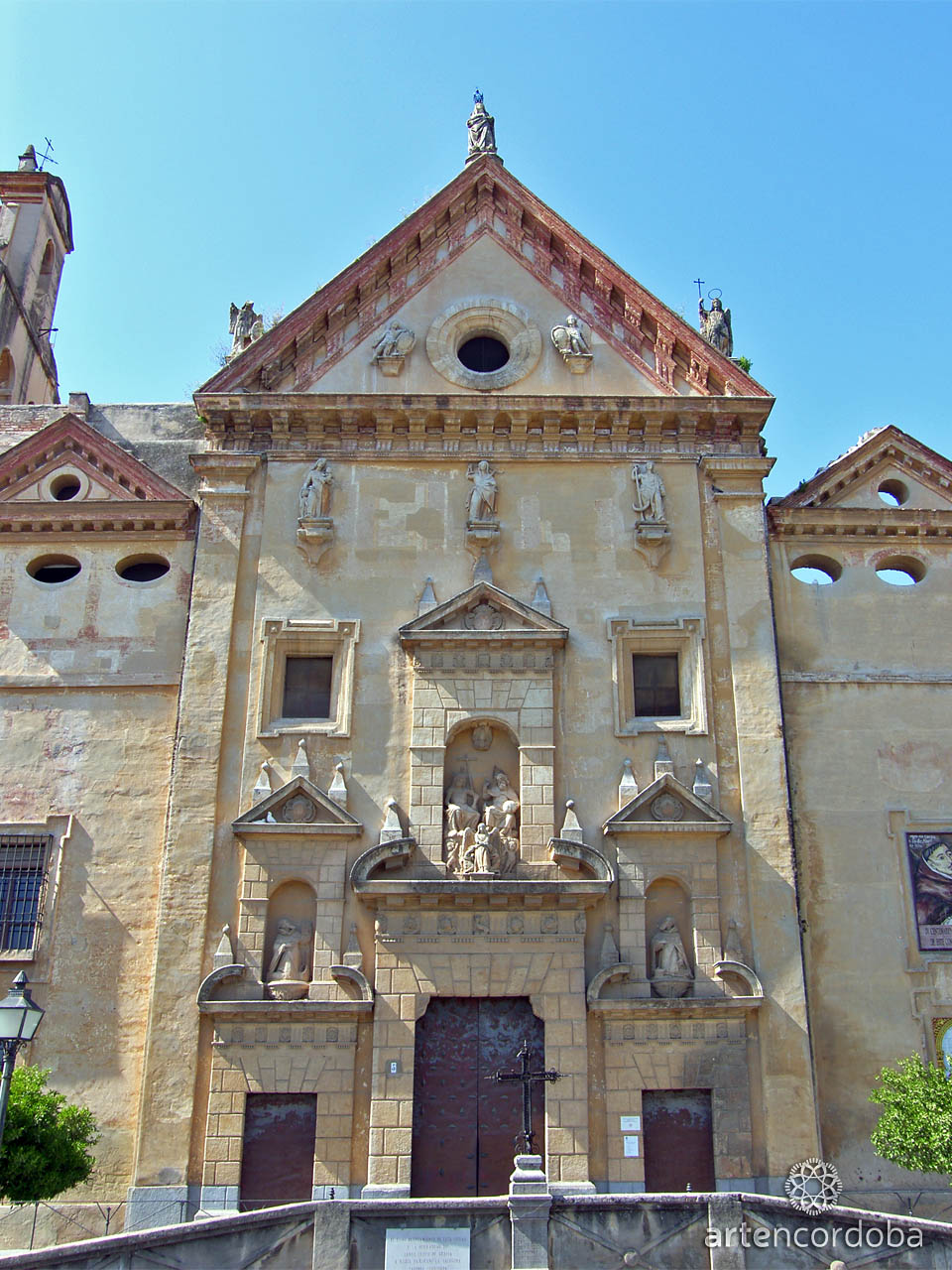 The facade of the church is designed as a monumental altarpiece with three lintelled openings, sculptures in niches of San Juan de Mata, Félix de Valois, and a central group of the Angel, as well as personifications of the theological virtues of Faith, Hope, and Charity, along with other details such as the archangels San Miguel and San Rafael.