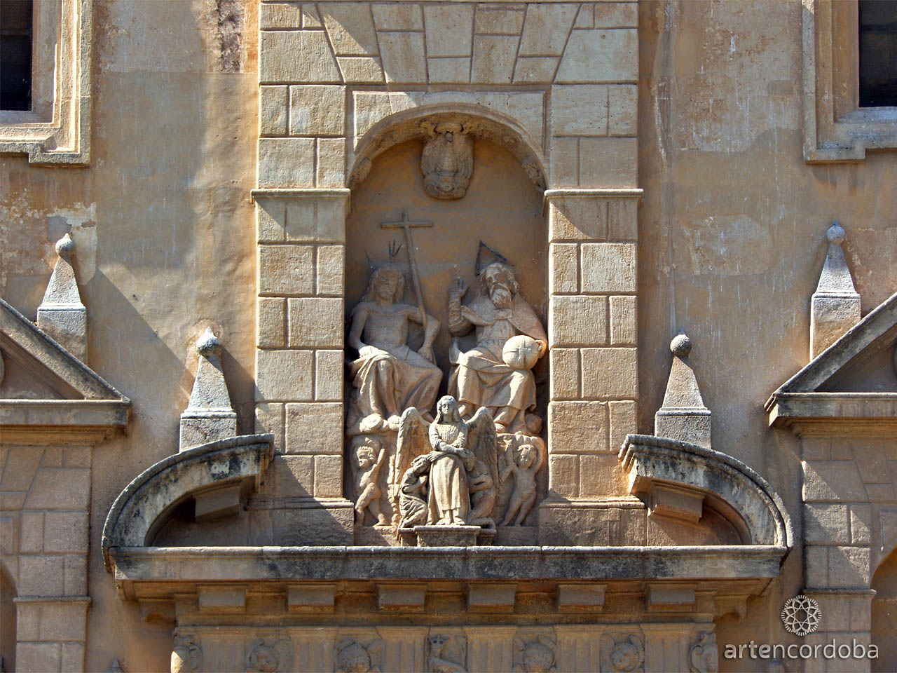 Above them are three sculptures in niches: Saint John of Matha and Felix of Valois, founders of the Trinitarian Order, kneel in prayer on either side, while at the center is a sculptural group of the Angel presenting the captives to the Holy Trinity—all of them housed in niches crowned by triangular pediments.