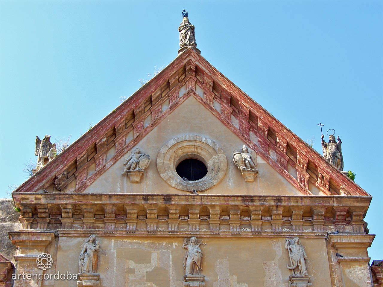 Higher up, on pedestals, are the personifications of the three theological virtues: Faith, Hope, and Charity. The façade is topped by a large triangular pediment containing two more sculptures—two supporting angels flanking the central oculus that provides light to the temple. On the lower corners of this pediment are the archangels Saint Michael and Saint Raphael, and at the top, crowning the ensemble, is the Virgin of Grace.