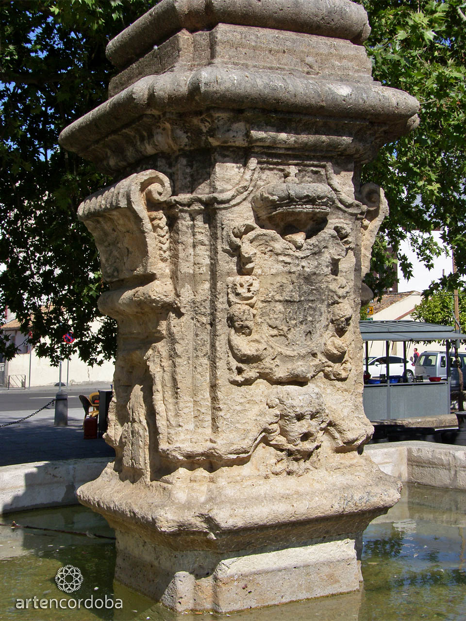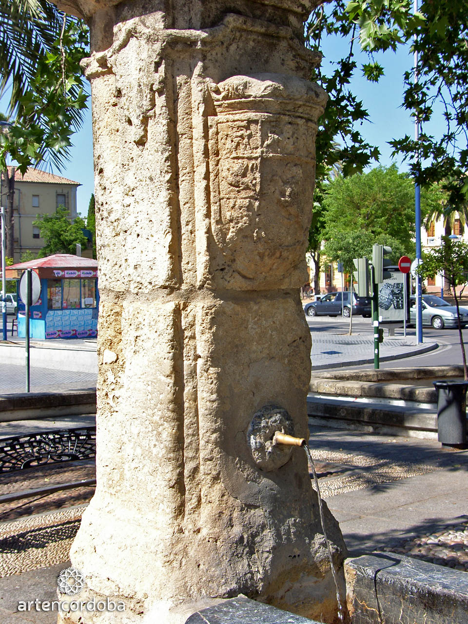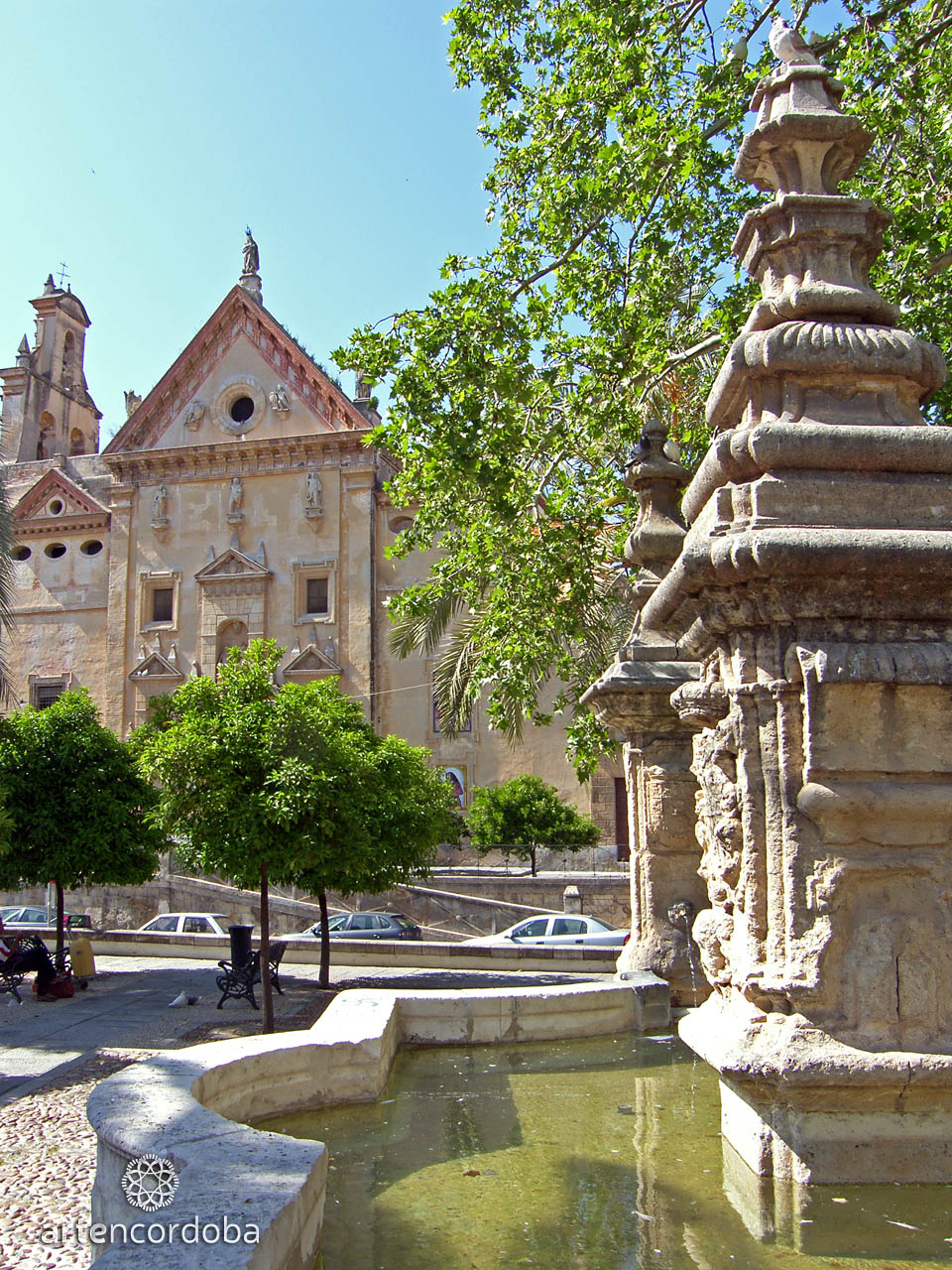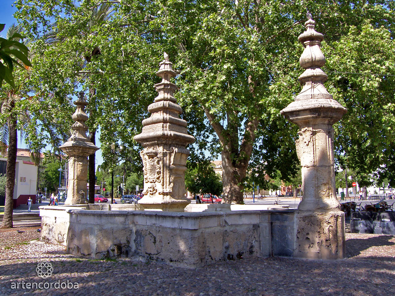 The lush vegetation that fills the Plaza del Alpargate barely allows the monumental fountain to be appreciated from afar. Its weathered limestone transports us to Cordoban Baroque, though it features some uncommon elements for our city—some speak of a certain Incan influence. A tall basin forms a base of lines and curves, from which three pillars topped with pinnacles rise, pouring water. Next to the fountain stands a small Triumph of Saint Raphael, brought from the old El Arcángel Municipal Stadium.