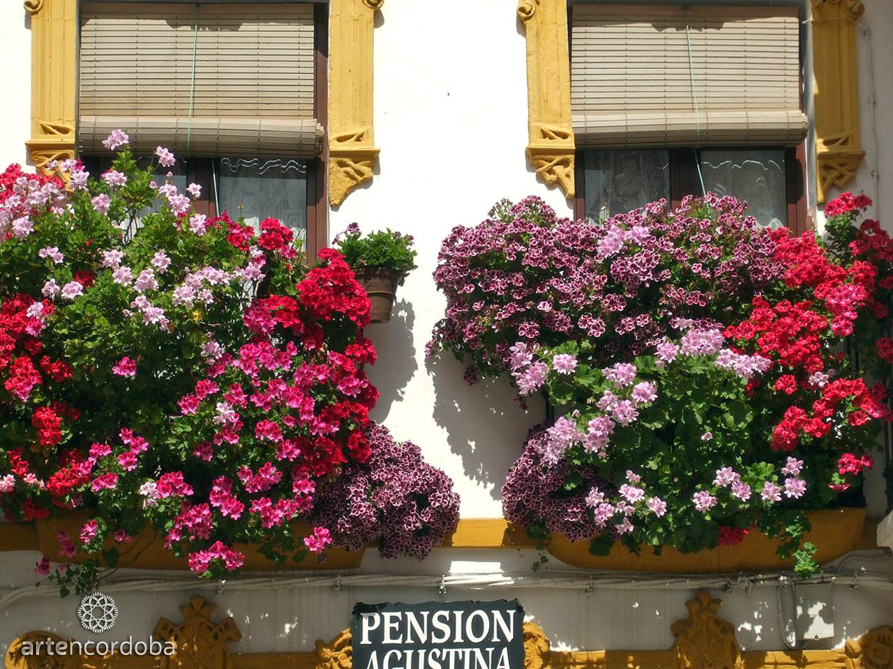 There are many types of flowers that can adorn these beautiful white façades with their wrought iron grilles and balustrades of iron or stone, just like those that decorate the cordobés patios. However, long hanging plants or flowers such as geraniums, bougainvilleas, or carnations in bright and cheerful colors tend to prevail.