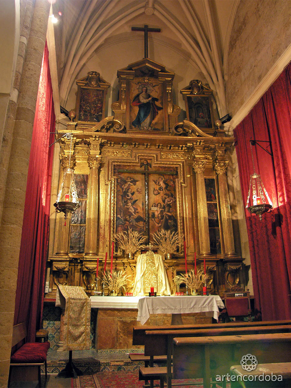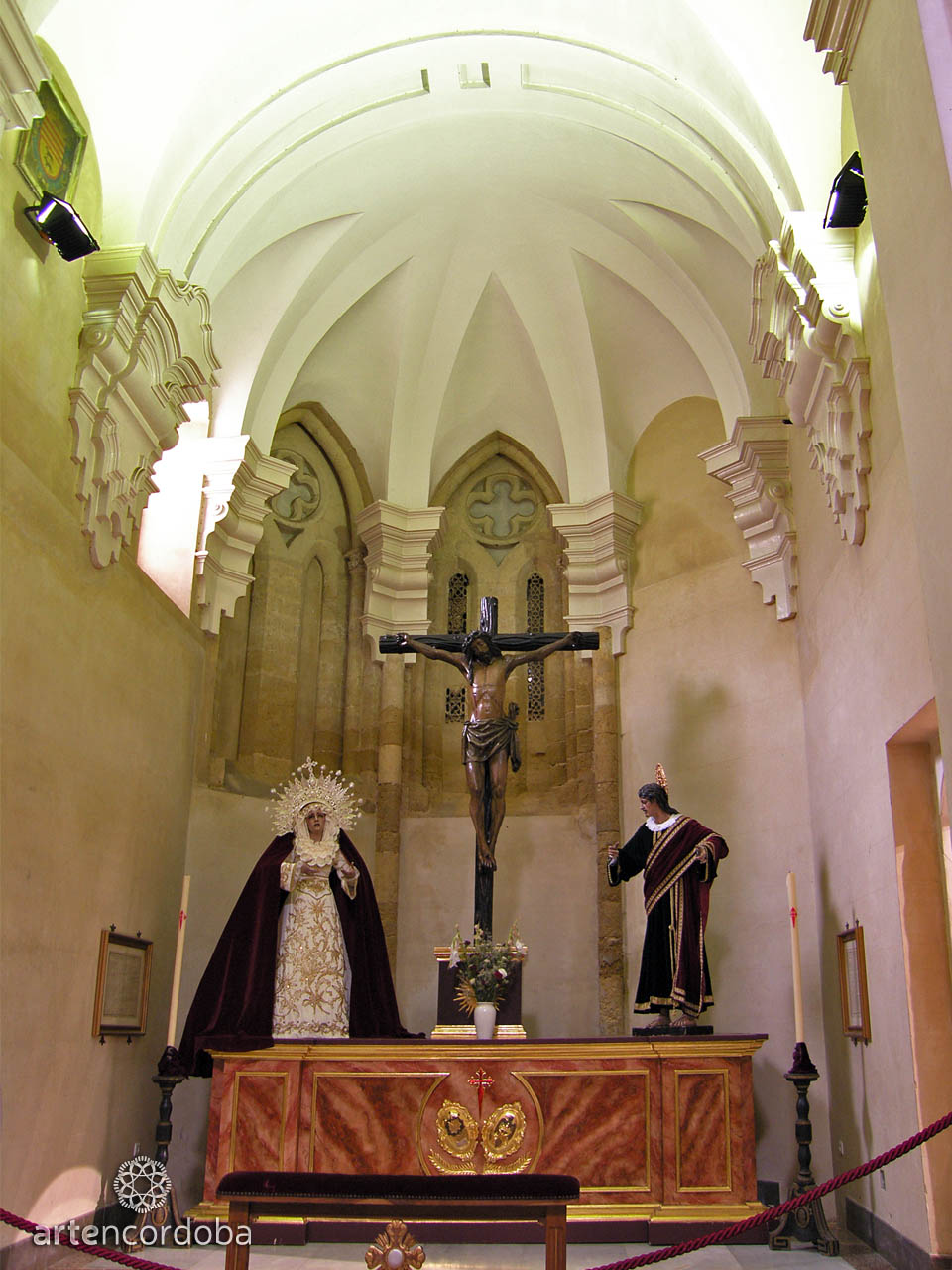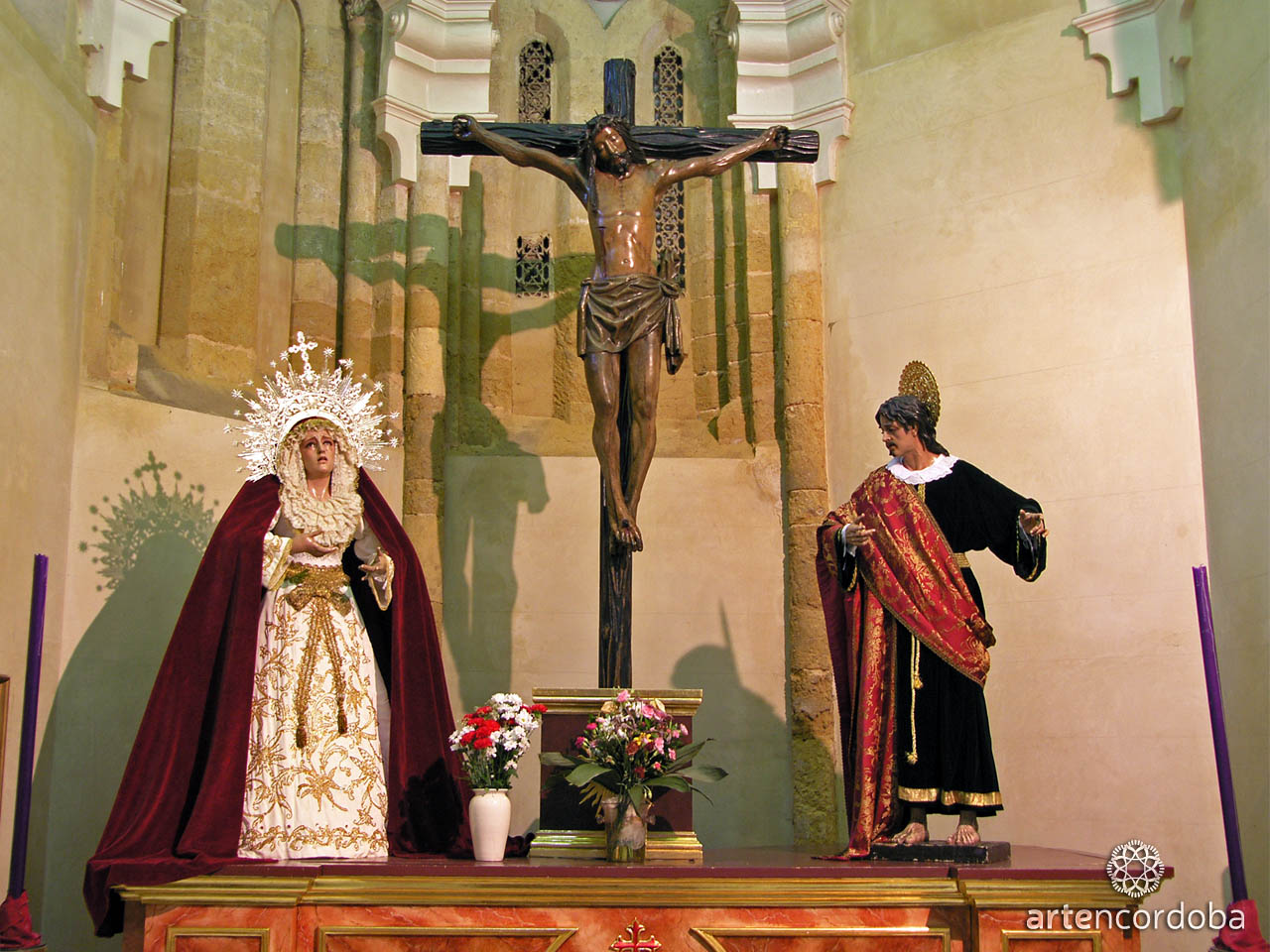 On the Gospel side are several of the main images of the well-known Brotherhood of Las Penas de Santiago, specifically those of the mystery group that processes through the streets of Córdoba on Palm Sunday. At the center is the titular image of the brotherhood, the Most Holy Christ of the Sorrows, an anonymous 13th-century work. The Lord is flanked by a sorrowful Virgin, Our Lady Mother of the Forsaken, and a figure representing St. John the Evangelist, both works by the Sevillian sculptor Antonio Eslava Rubio.