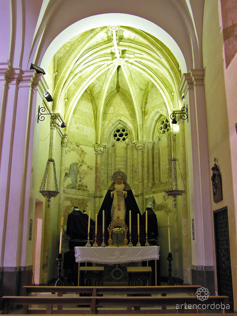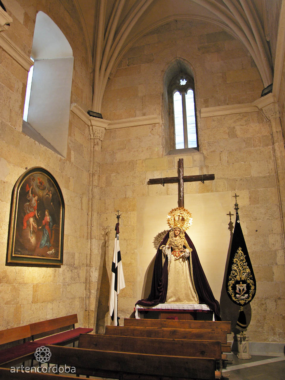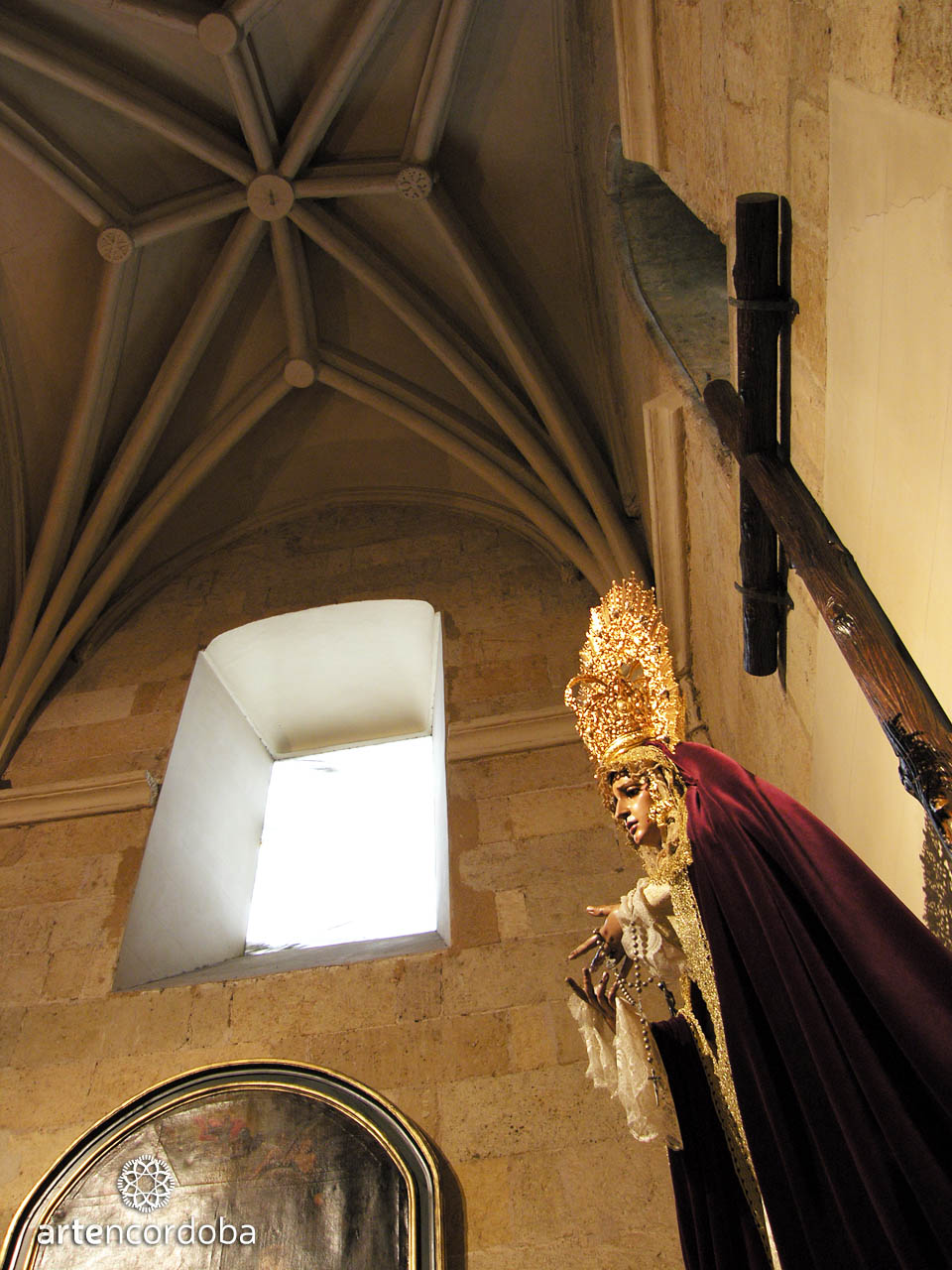 At the foot of the chapel stands the titular image of the other brotherhood hosted by the Church of Santiago, Our Lady of Solitude, a polychrome wooden sculpture created by sculptor Luis Álvarez Duarte around 1974. The Brotherhood of Solitude fills the streets of Córdoba with silence and solemnity during the evening of Good Friday.