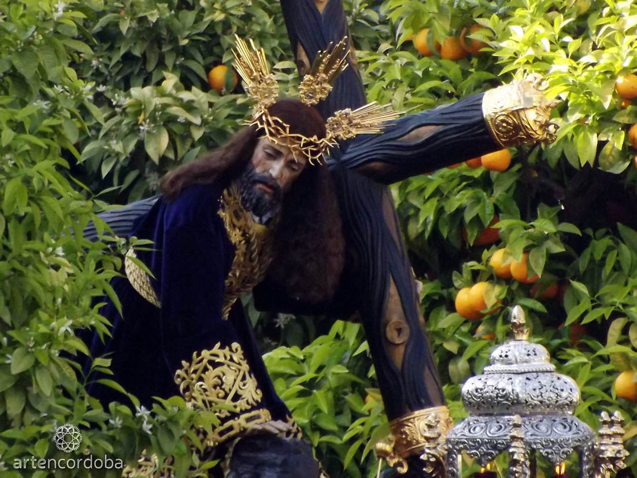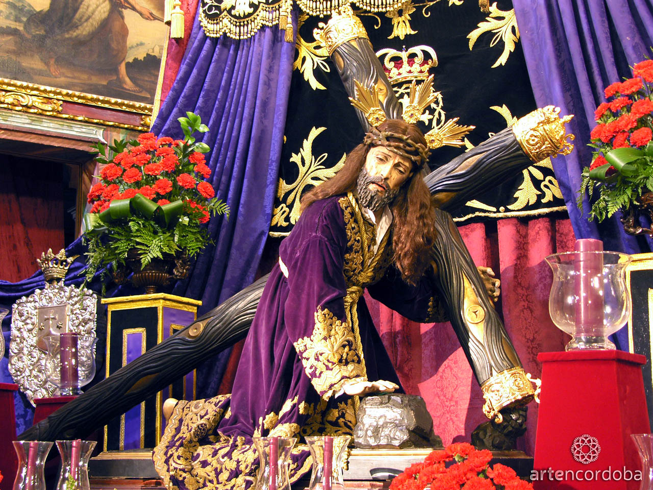 On its procession, Nuestro Padre Jesús Caído (Our Father Fallen Jesus) wears a purple velvet tunic, decorated with golden-thread embroidery and high quality flowery motifs. The belt, also in golden thread, perfectly matches the golden colour of the flames on his head and the crown of thorns, as well as the edges decorating the ends of the tree-like Cross.