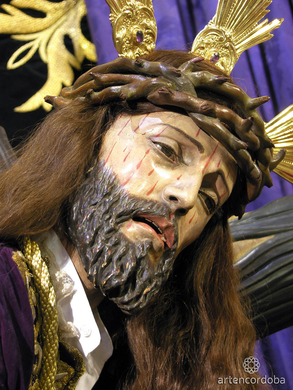 The face of the Lord is characterised by his low look, lost in thought, and his eyebrows slightly frowned, thus showing a gesture of contained pain. The wounds caused by the crown of thorns make blood constantly fall down his face, including his beard, which consists of parallel locks.