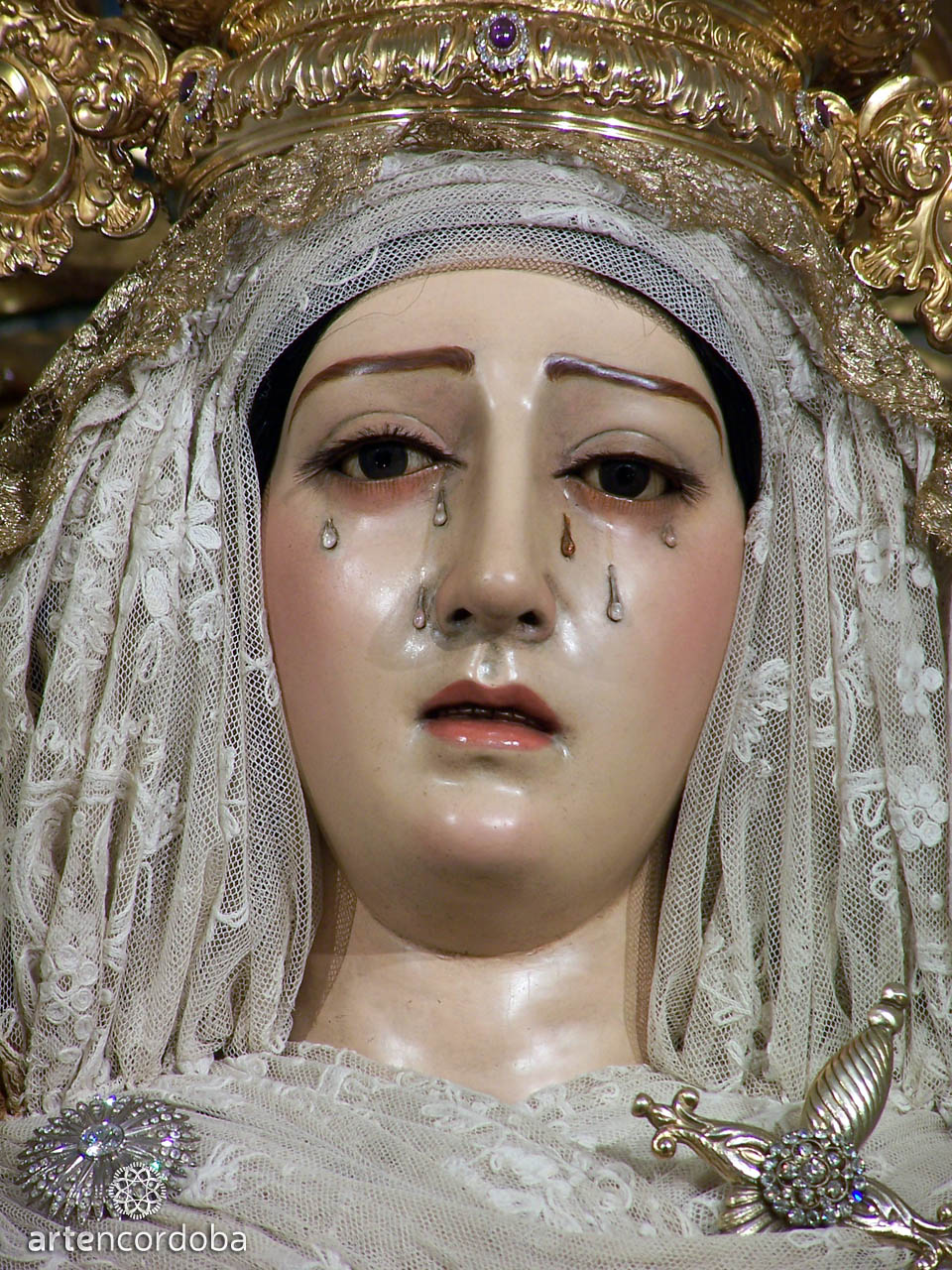 It is an image to be dressed, with only her hands and face carved. Her face is characterised by her low look and reddened eyes, thus showing a very deep and sad expression. Her half-opened mouth and her prominent nose make her a very beautiful Virgin.