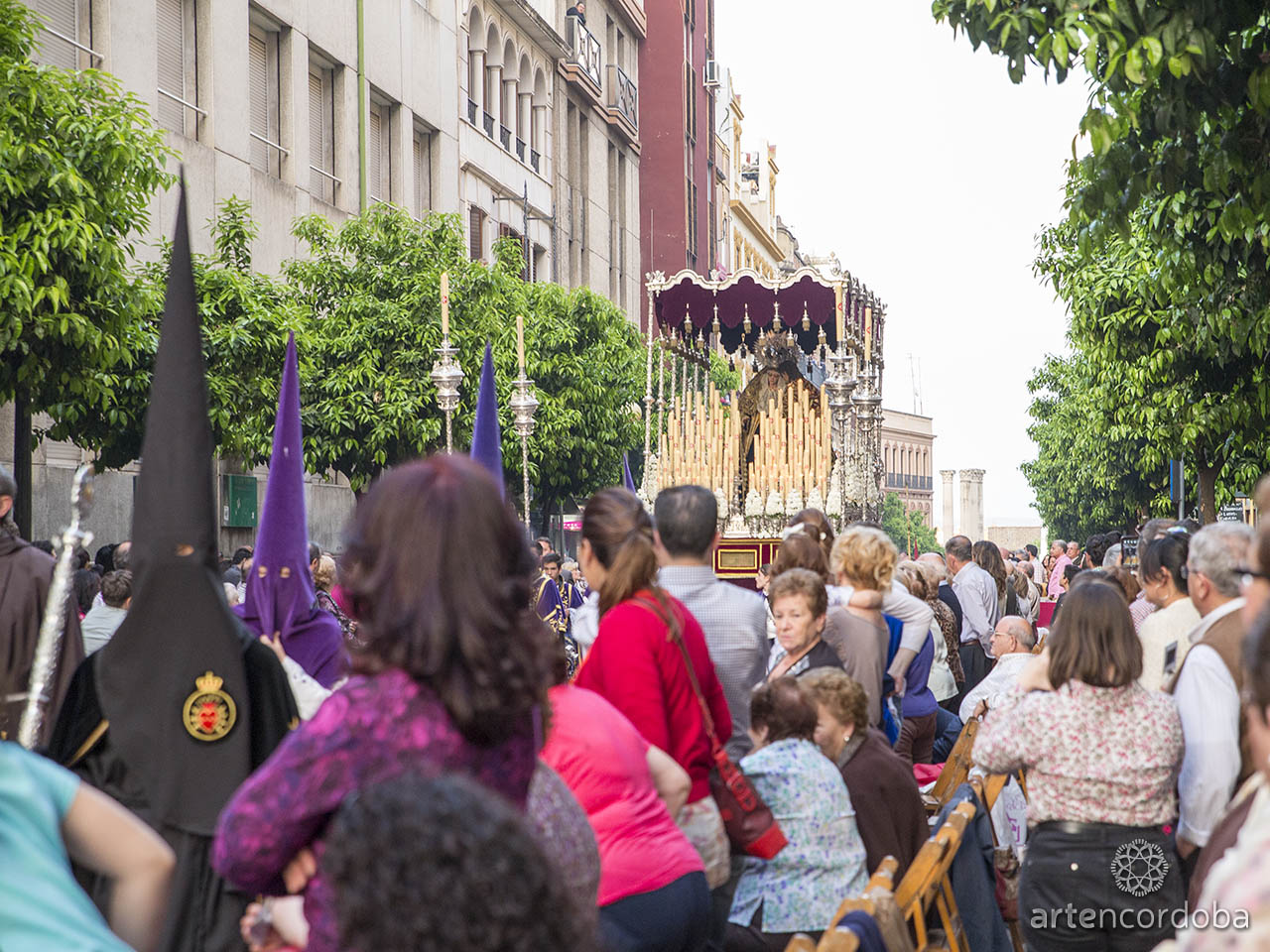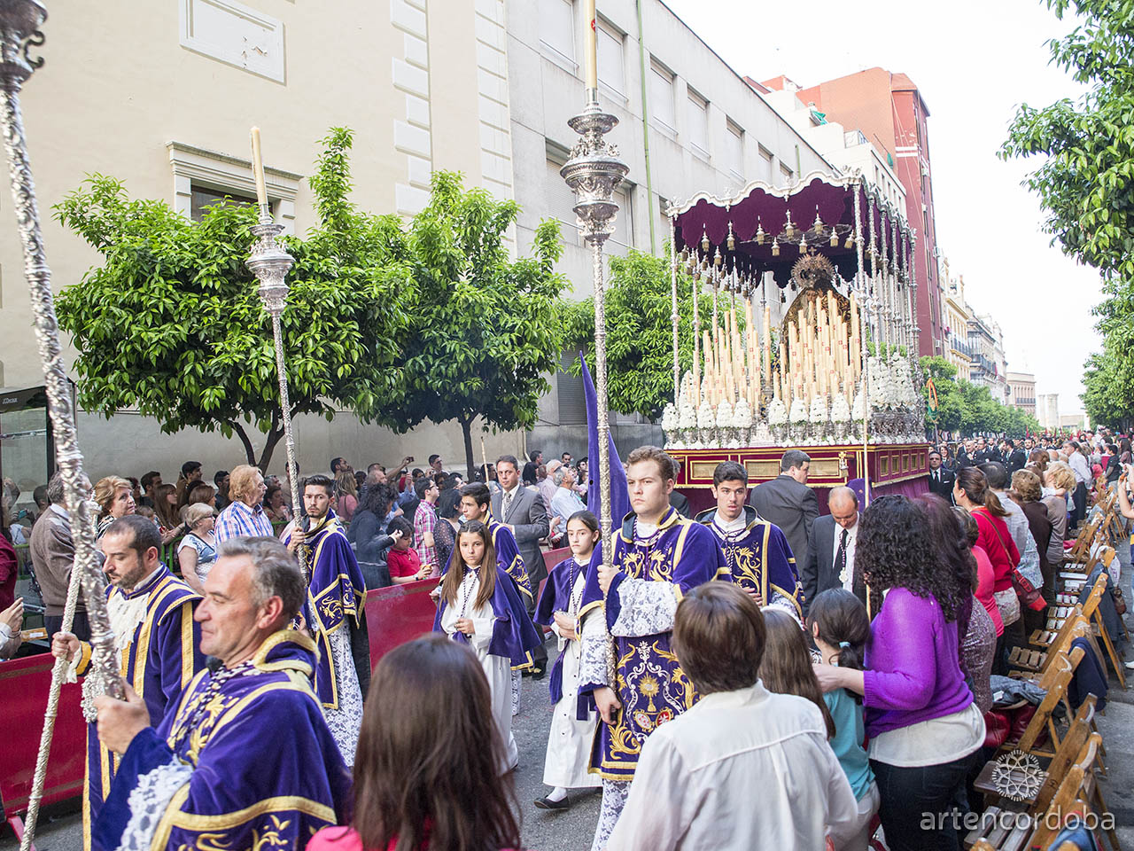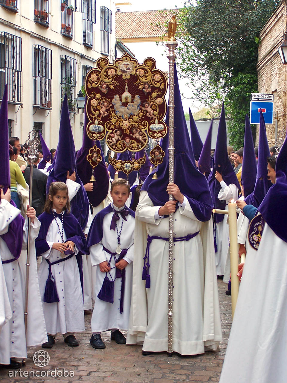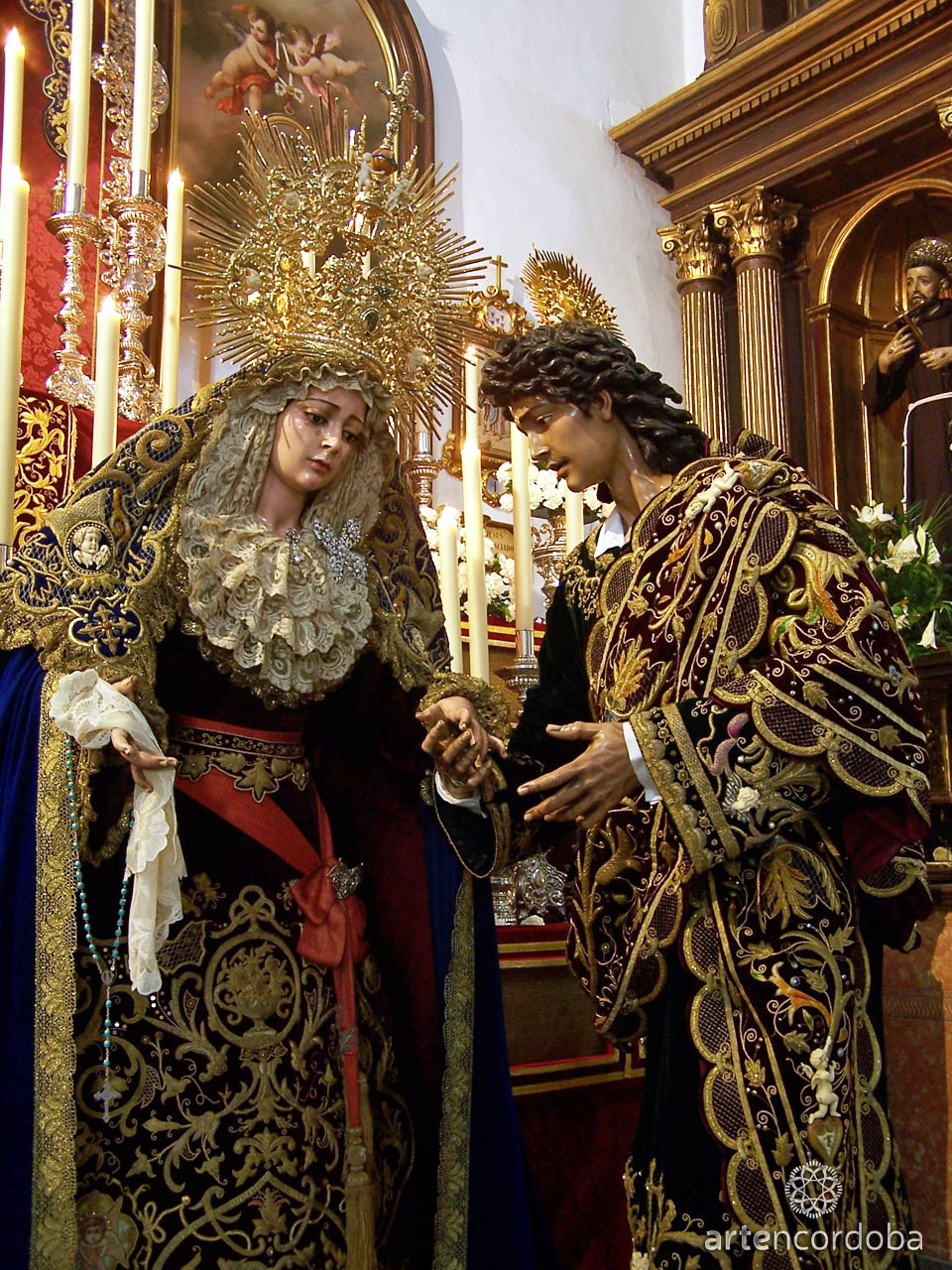 It was founded in 1976, in the monastery of Cisterby students of La Salle School. Their first station of penance took place on Holy Tuesday 1989. In 1996 it was transfered to the convent of Santo Ángel (Capuchinos),with which it has been closely linked since its foundation, and it has been its offical canonical see since 15th January 2002, according to a decree by the Orderof Minor Capuchin Brothers of the Bética Province. In 1998 the image of Señor de la Sangre (Lord of Blood) was included in the penitential retinue. In September 2005 an extraordinary procession took place for the first time with the founding image, made by Eslava, the Virgen de Los Ángeles en sus Misterios Gozosos (Virgin of the Angels in her Joyful Mysteries).