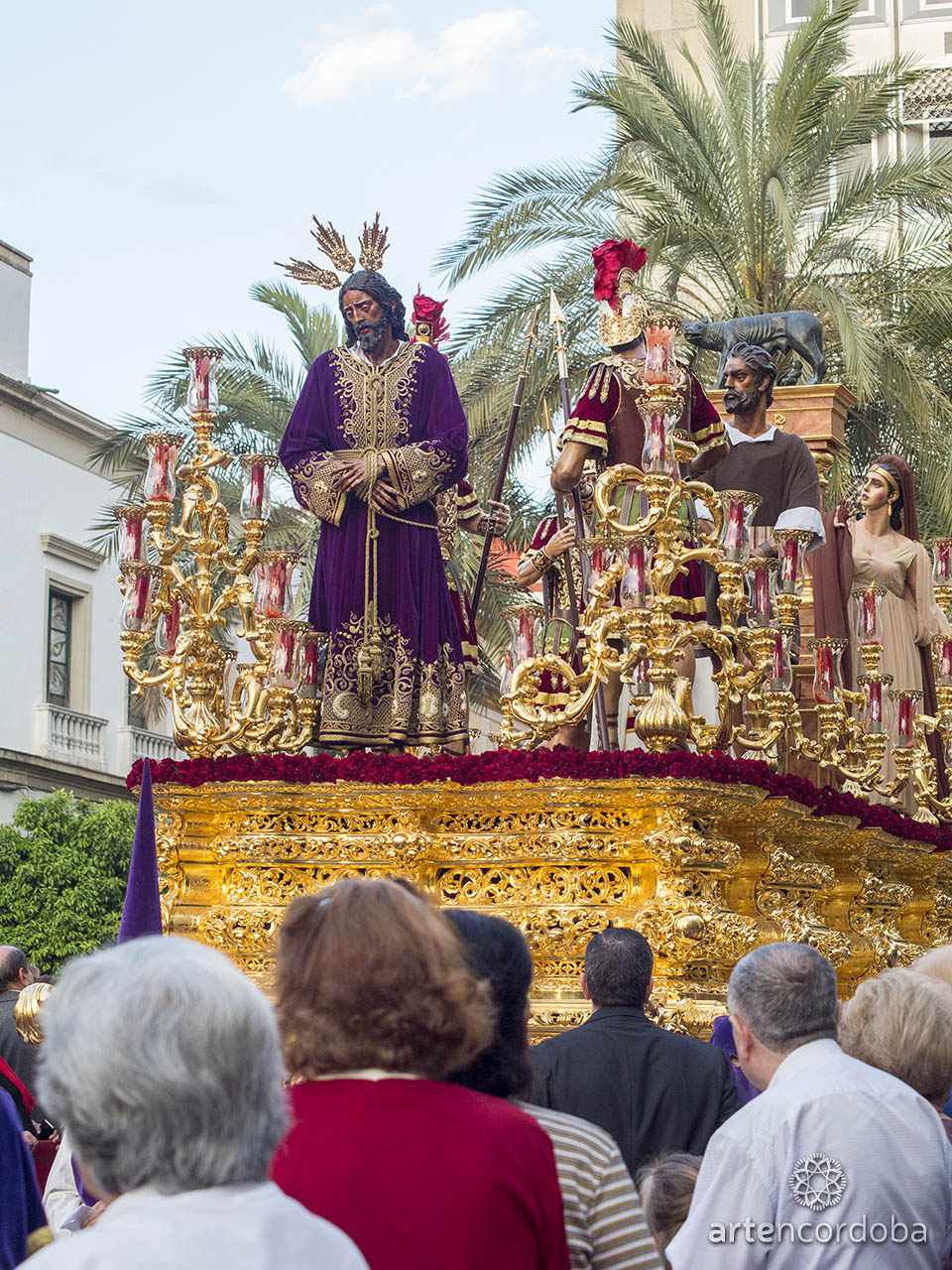 The Lord is standing, at the front of the pace, before the people. The scene tells the moment when Pilate, together with Jesus and Barabbas, asked the crowd which of them should be released at Easter. There are up to 7 figures on the pace, all of them, except for the Lord, made by Francisco Pinto Barraquero from Jerez. Behind Jesus, there are two Romans wearing breastplates and short skirts, one of them holding the rope with which Barabbas is tied, who is staring at Jesus. Behind them, we can see Pilate, pointing at the Lord, as if asking the people. The scene is completed by a third Roman and Claudia Procula, Pilate’s wife.