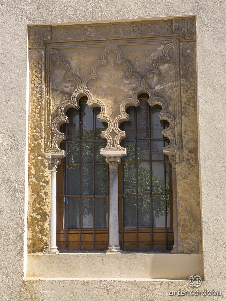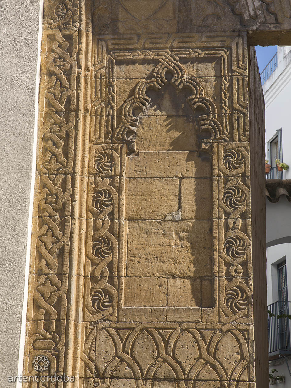 The façade has only four openings. The main one is the entrance doorway, curiously located to one side, which lessens its prominence in the whole. Some authors describe it as lintelled and others as an arched lintel, but in reality, it consists of prominent voussoirs, decorated with Mudejar lacework and sebka motifs. On both sides, as well as on the jambs, there are small blind windows with polylobed arches. All of this is topped by three slender decorative strips with geometric motifs.