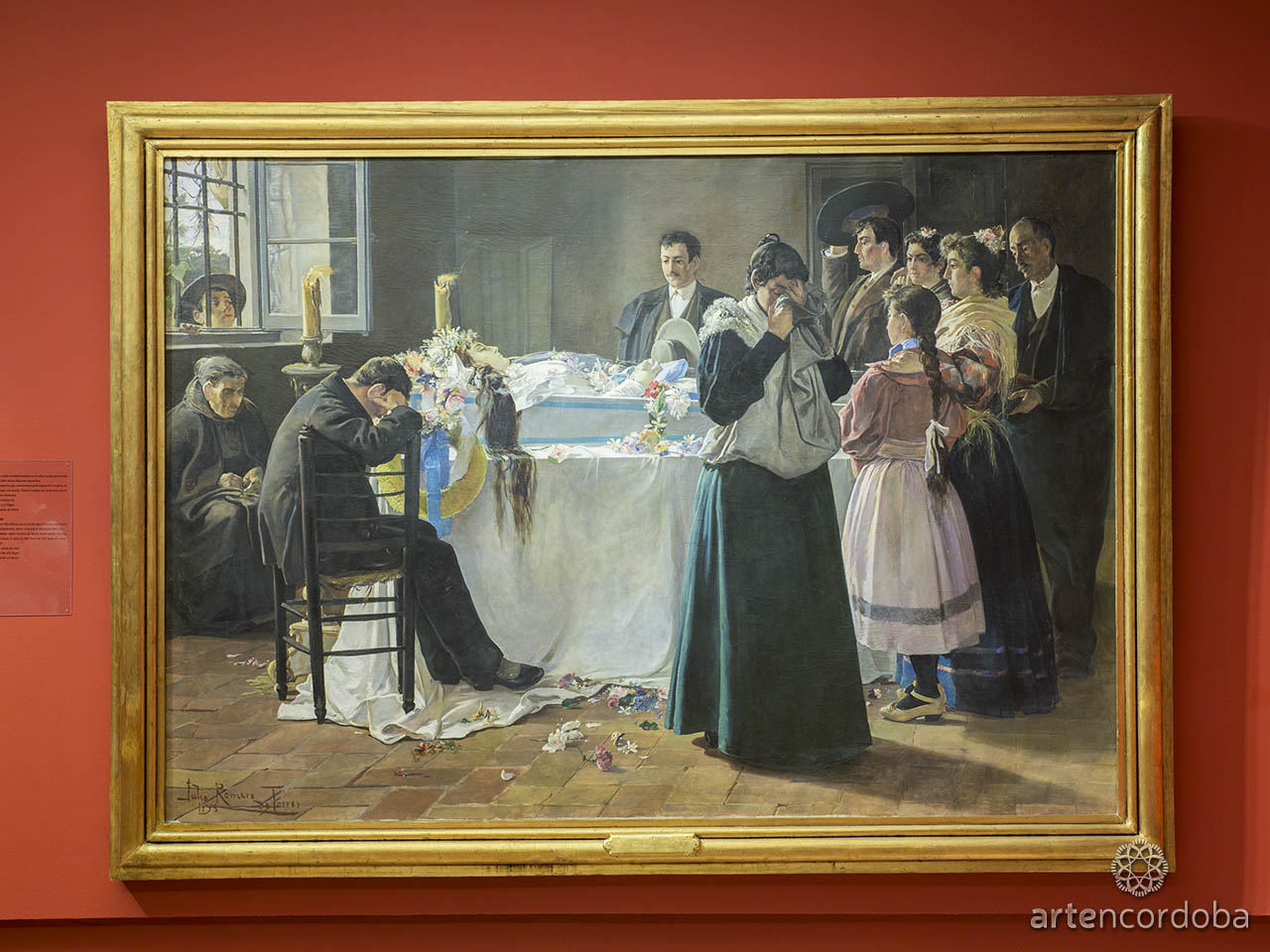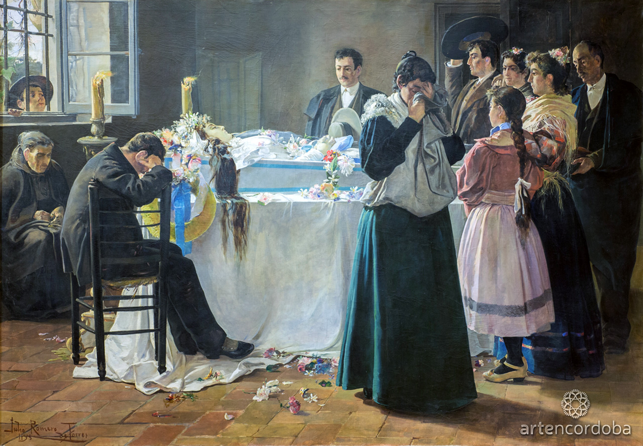 With this work, Julio Romero de Torres gained recognition at the 1895 National Exhibition, earning an honorable mention. The painting brings together the three themes that marked his career: women, death, and flamenco. The scene shows a young woman lying dead in her coffin, surrounded by family members, with dramatic lighting coming from a side window.