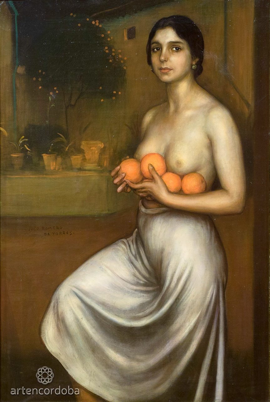 A mature work in which the artist worked with model Asunción Boué. Julio Romero de Torres approached the still life genre in a very personal way, giving a prominent role to the woman. The semi-nude model holds several oranges to her chest while looking at the viewer, giving the composition a strong erotic element. In the background, the artist chose a typical Córdoba courtyard.