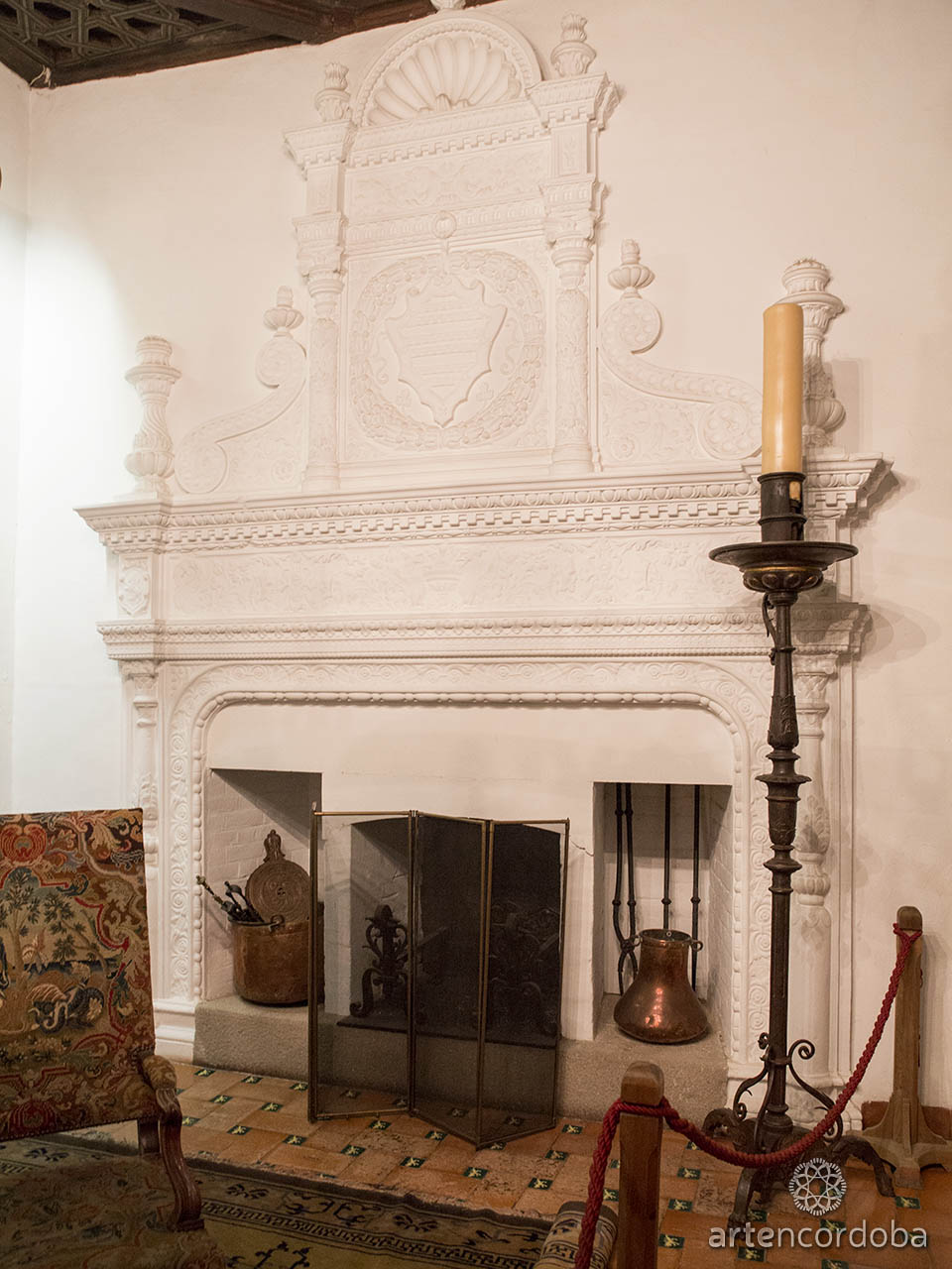 At the back of the Marchioness’s Study stands a beautiful fireplace made of white plasterwork, where friezes, garlands, and scallop shells give it a markedly classical character that, however, harmonizes well with the rest of the room. In the center of the composition, surrounded by garlands, is the coat of arms of the Saavedra family.