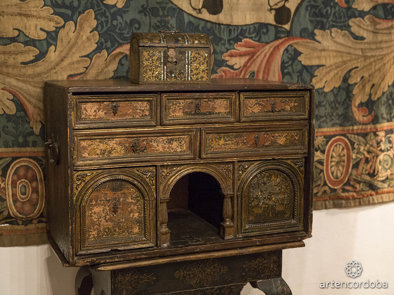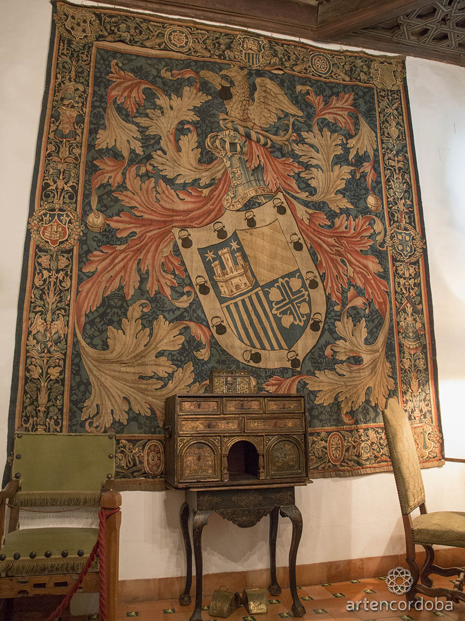 On the opposite wall stands out the marchioness’s writing desk, along with various pieces of furniture and items intended for that purpose, including a 17th-century tapestry with a heraldic theme. There is also a Spanish Baroque table with stretchers, whose tabletop features tortoiseshell and ivory decoration with miniature scenes from the life of Christ.