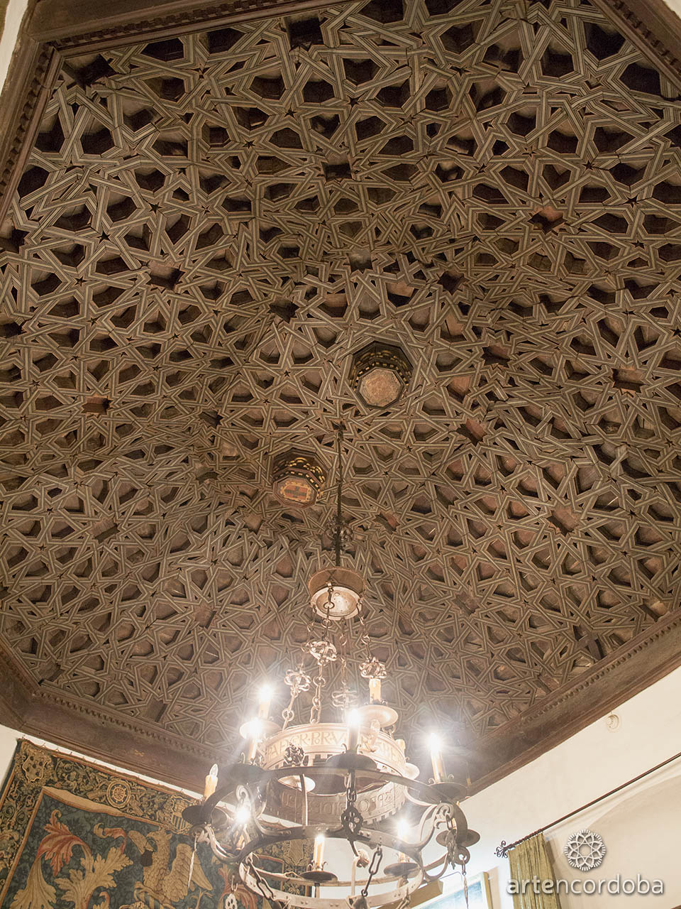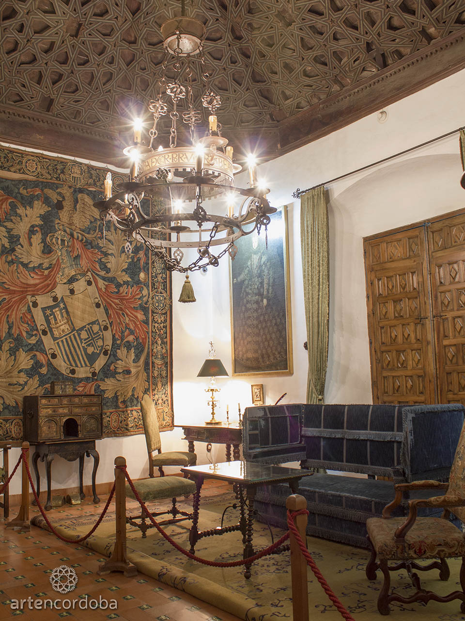 Rectangular in shape, it is covered by an elaborate coffered ceiling made of wood and decorated with Mudéjar-style lacework motifs, such as eight-pointed stars. Hanging from its center is an exceptional, uniquely designed lamp made of 17th-century wrought iron, featuring the famous mottos of the House of Saavedra: “To suffer in order to live” and “Blessed are those who fought for the faith.”