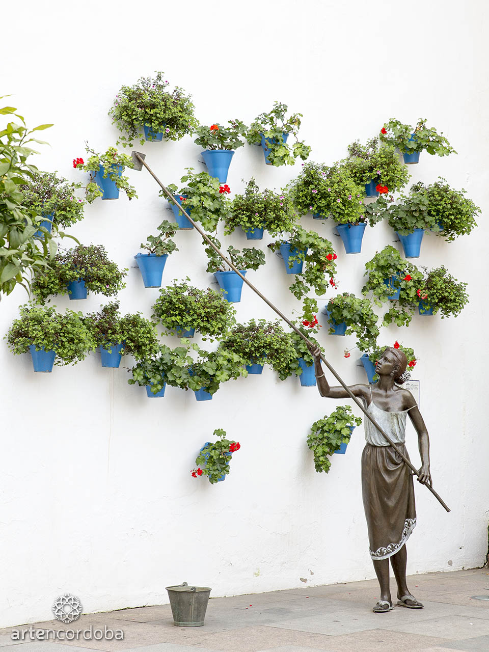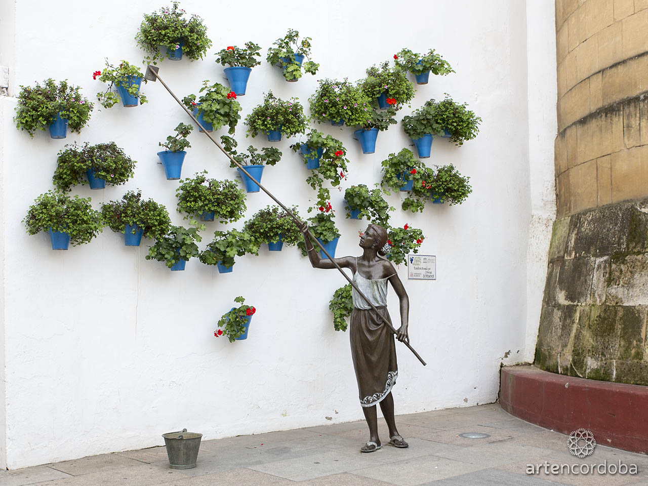 La muchacha aparece un tanto desaguisada, de andar por casa, con una camiseta de tirantes y una falda rematada en brocados. Lleva el pelo recogido con un florido moño de azahar, que deja ver los pendientes de filigrana cordobesa en plata, que penden de sus orejas. La muchacha porta la caña con atención, pues se trata de una tarea que requiere concentración y atino. A sus pies hay un cubo, de éste saca el agua que alimentará a las plantas. Las macetas, numerosas y frondosas, pueblan buena parte de la fachada, creando el clima necesario.