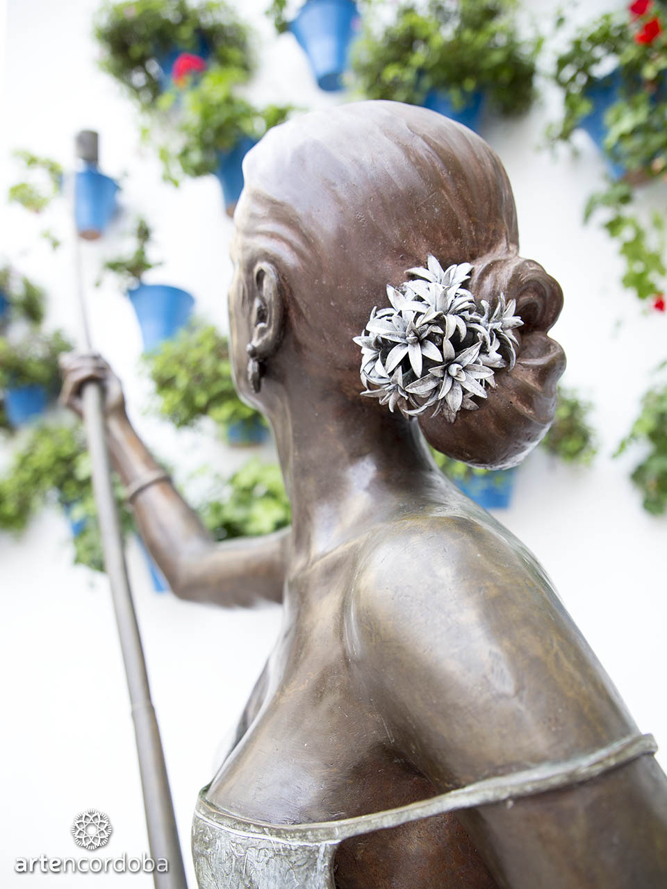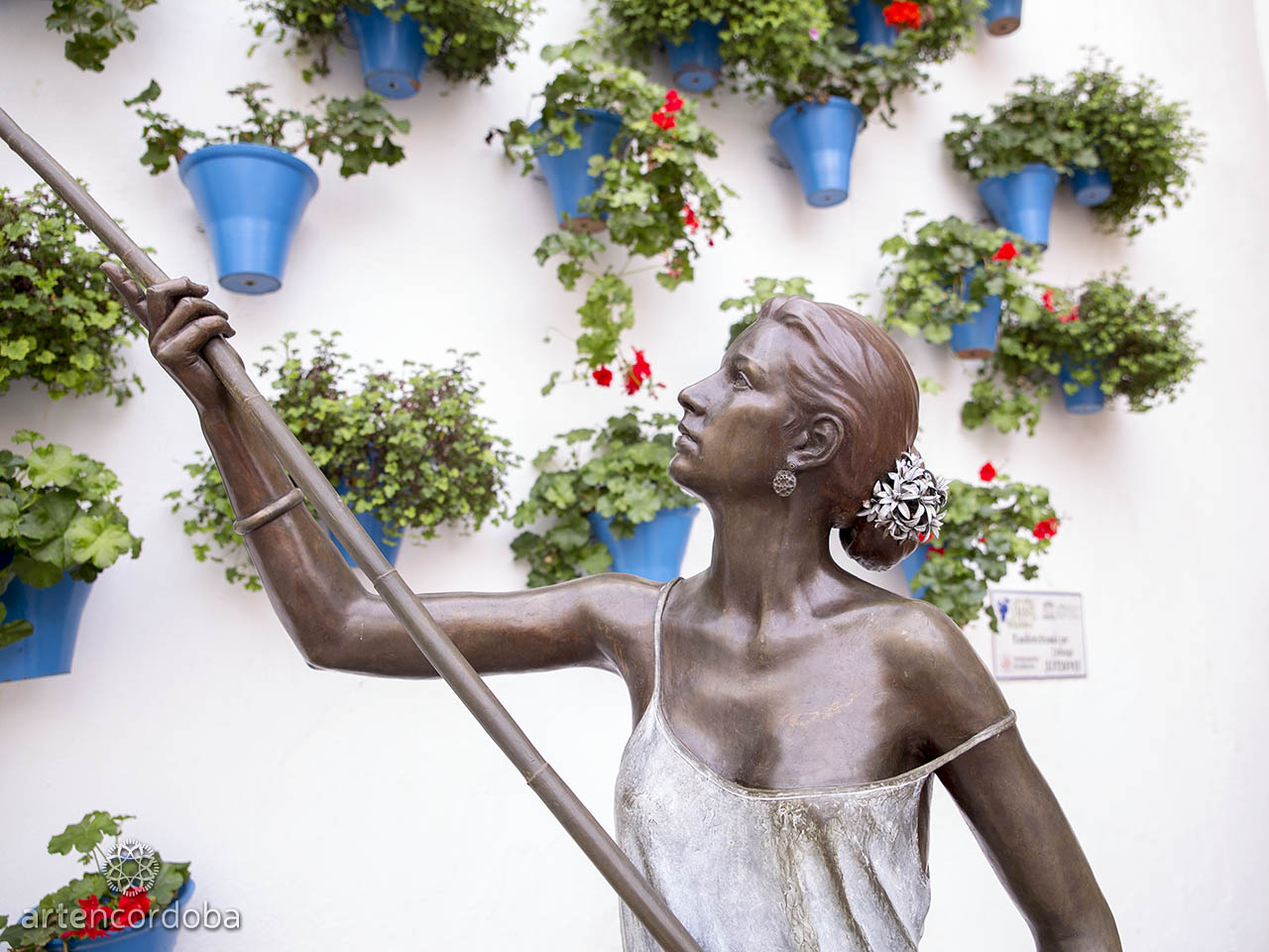 Según comenta Belmonte, ha tratado de representar un patio cordobés en su esencia. Para ello ha elegido el bronce para representar a una joven mujer regando las macetas de su patio con una caña unida a una lata, método tradicional muy empleado en Córdoba desde antiguo; de este modo se podían regar las macetas más elevadas sin necesidad de escaleras ni otros artilugios más pesados.