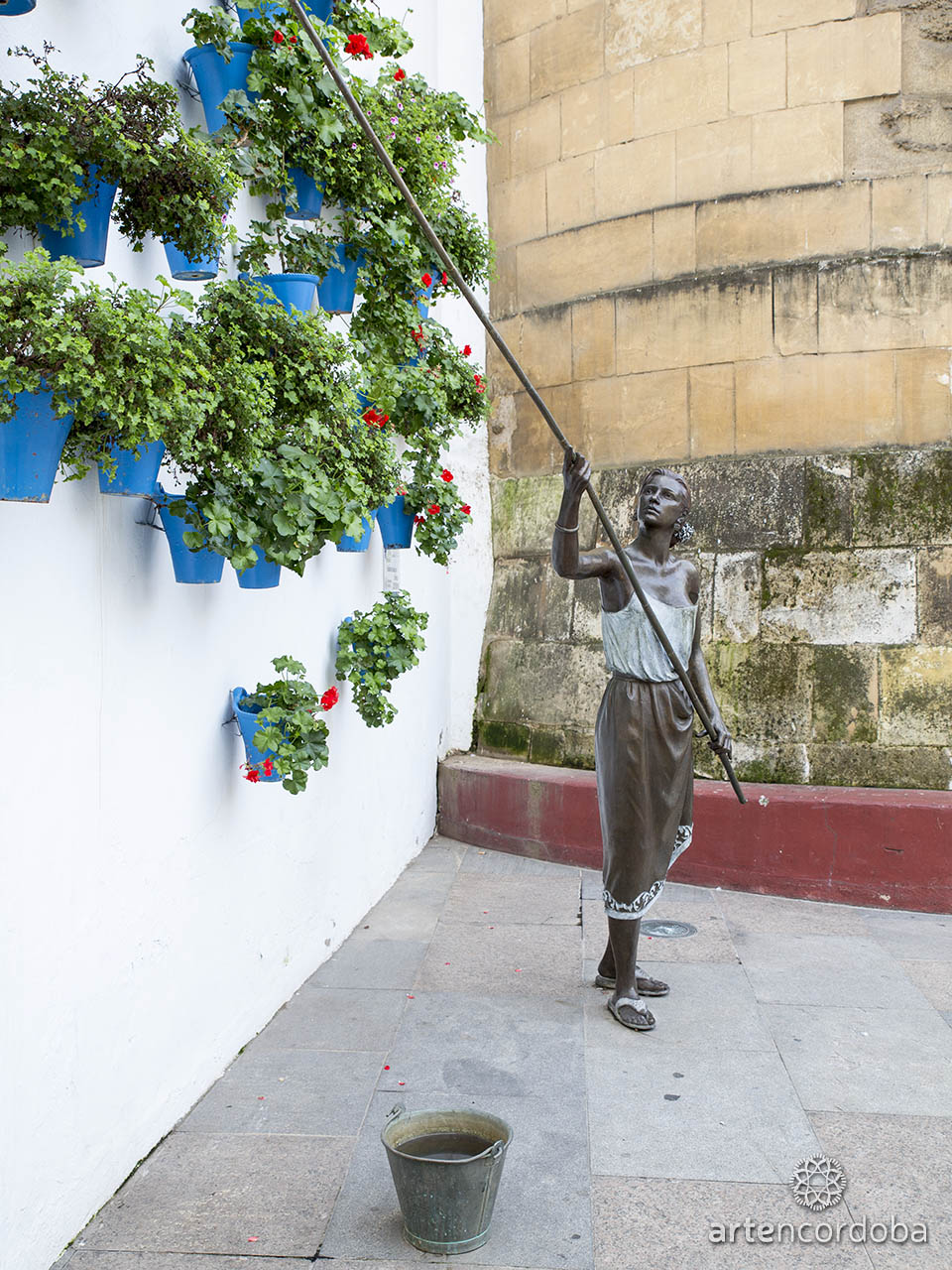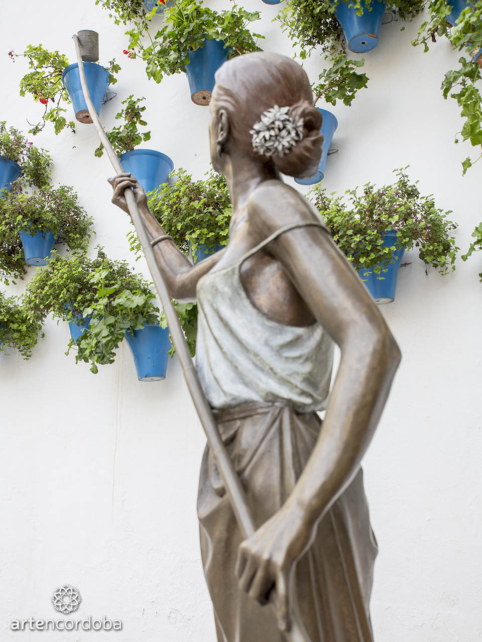 La escultura representa a una joven mujer regando las macetas de un patio cordobés, utilizando una caña unida a una lata, un método tradicional de riego. La obra simboliza la conexión entre el presente, el pasado y el futuro de la tradición de los patios.
