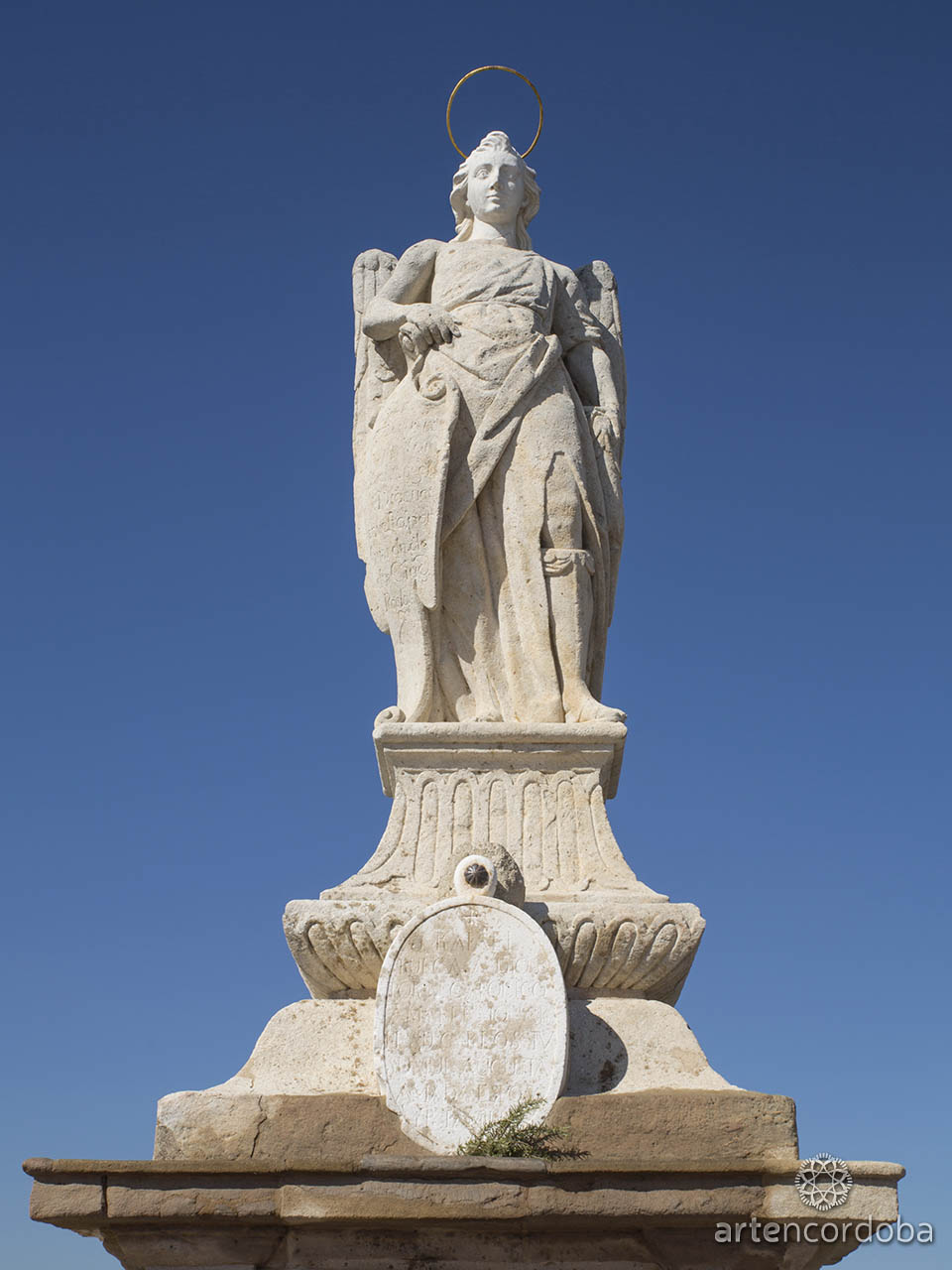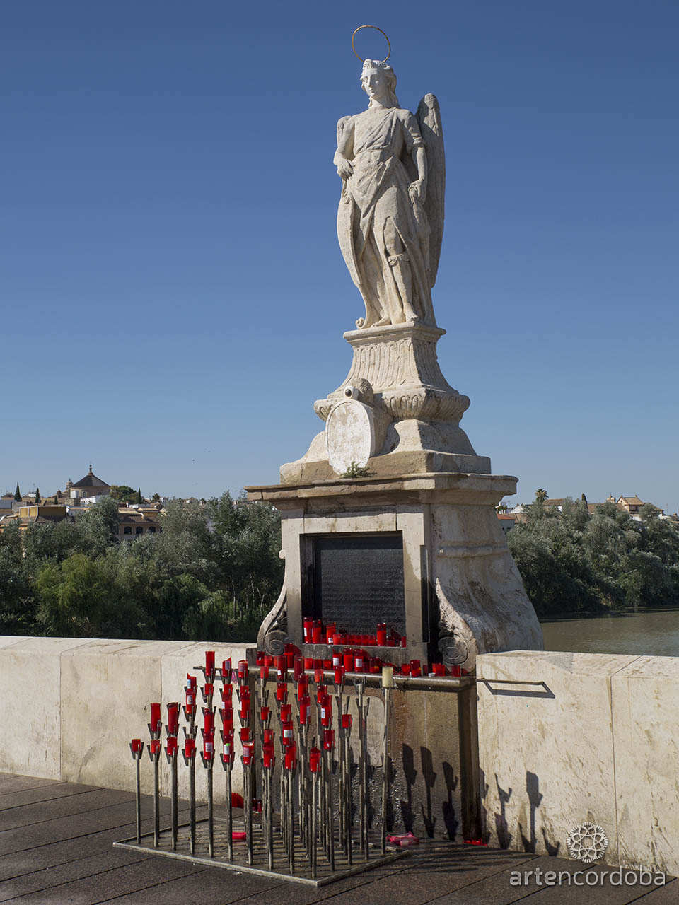 A mediados del siglo XVII estalló una epidemia de peste en la ciudad que causó estragos en la población. Cuando la peste remitió, fue colocada en el puente una imagen del Arcángel San Rafael, obra del escultor Bernabé del Río, por iniciativa del Padre Juan Bautista Caballero. Debajo, una lápida de mármol blanco reza: «A mayor gloria de Dios y culto de nuestro Santo Custodio, el gremio de curtidores y fabricantes de guantes renovó ésta santa imagen… septiembre 10 del año 1789». Se trata del arcángel más cercano al pueblo, y por ello siempre se le encuentra colmado de una espesa nube roja de velas, todas consumidas, fiel reflejo del cariño y la más profunda devoción que siente el pueblo de Córdoba hacia él.